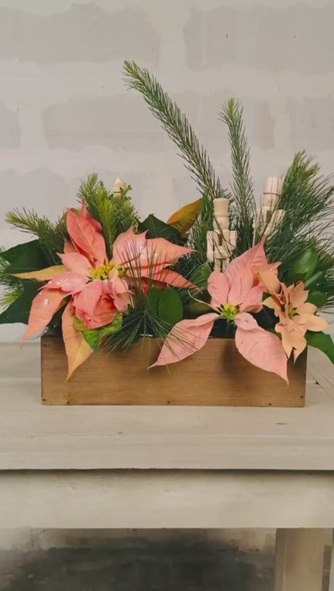 Centro de mesa navideño con nochebuena natural y follajes festivos cuidadosamente seleccionados. Esta composición combina la elegancia de la flor  con ramas de pino, eucalipto y elementos verdes que evocan la calidez de la temporada. Ideal para decorar tu mesa de comedor o sala durante las festividades. Cada arreglo es único y elaborado con atención al detalle para garantizar frescura y belleza duraderas.